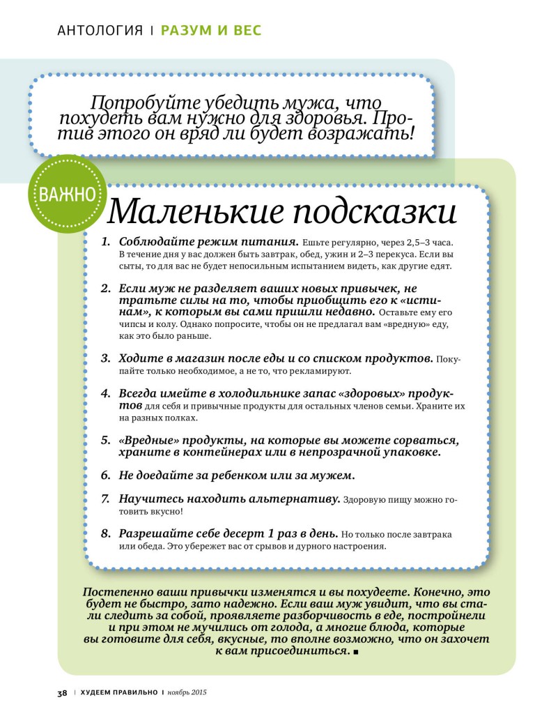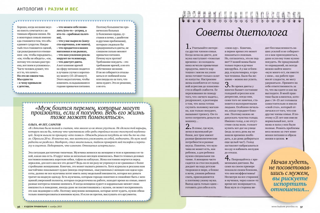 Мне очень приятно, что журнал «Худеем правильно» обратил внимание на эту тему и в номере за ноябрь, 2015 мы обсуждали вопрос, почему муж не хочет, чтобы жена худела и что делать. Я выступала в качестве эксперта.